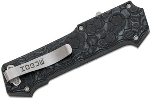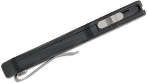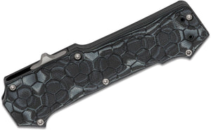 The Hogue Compound Out the Front, OTF, automatic is a hybrid of G10 and aluminum designed for repeatable one-handed operation in close-quarter situations. A textured G10 frame surrounds a 6061-T6 aluminum chassis for extreme strength without the associated weight. It has the same basic grip as the original Hogue OTF but with a more angular handle shape and more compact thumb slide. This trigger fires the blade with impressive force and retracts is just as fast. Built to last, the Compound will fire consistently time and time again with repeated reliability.
