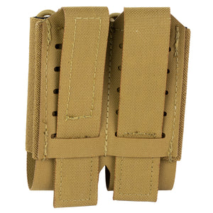 The Haley Strategic Double Pistol Mag Pouch in Coyote offers versatile storage for handgun magazines and similar-sized items. Designed to meet law enforcement and military requirements, this pouch features an elastic retention system lined with anti-slip polyester knitting. The shock cord pull tabs allow for quick access and adaptability to various magazine sizes and tools.